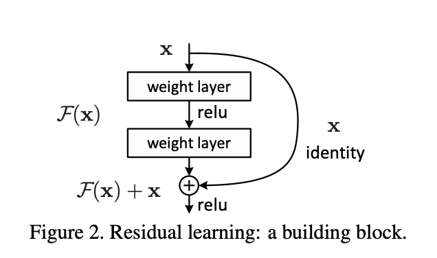In Figure 2, the rounded x on the right represents the input. Previously, standard networks used only the output value for a given input. However, in ResNet, the input itself is carried forward and used in the computation. This structure is called a building block, where the function F(x) passes through weighted layers and is then added to the input x, forming the equation F(x) + x = H(x). This is known as Residual Mapping.