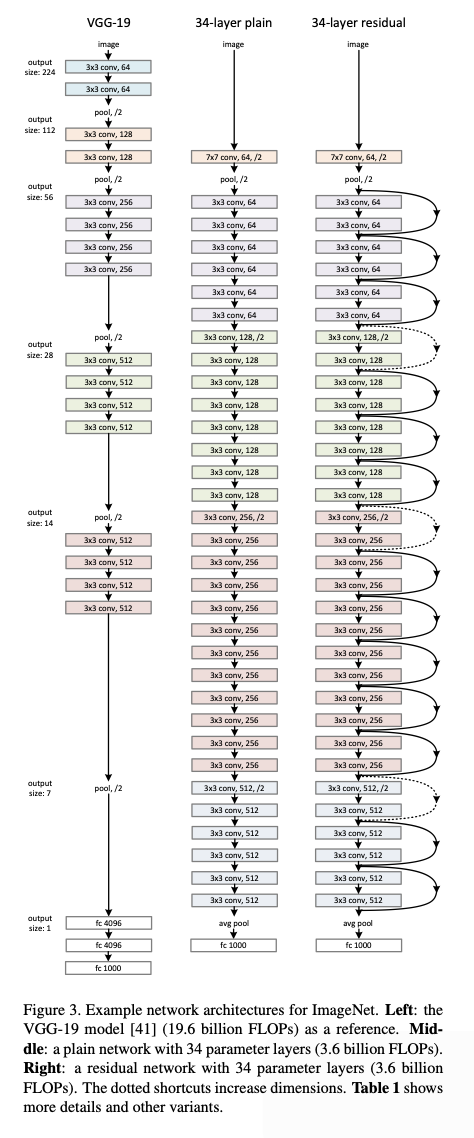 Residual=H(x)−x=F(x)The diagram compares VGG-19, a plain network, and a residual network, clearly showing that ResNet continuously carries residual mappings forward to the next layers.