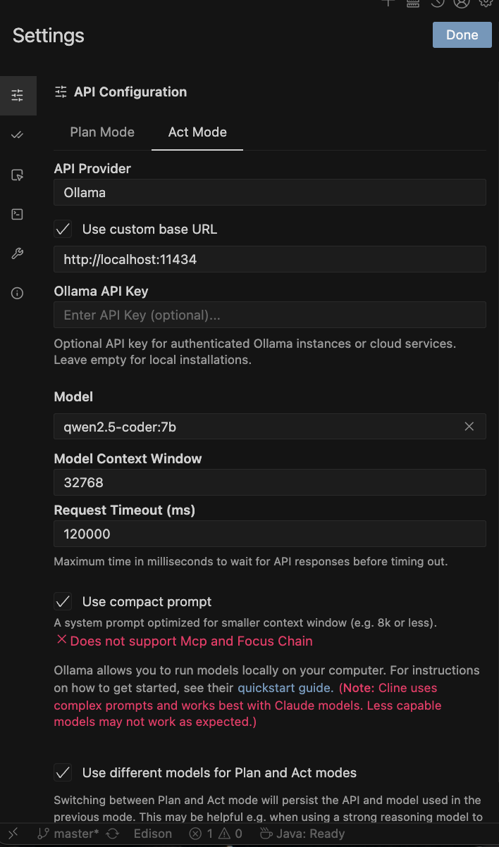 > Important* Enable "Use compact prompt" — it reduces the system prompt size significantly, which is crucial for local models with limited context.