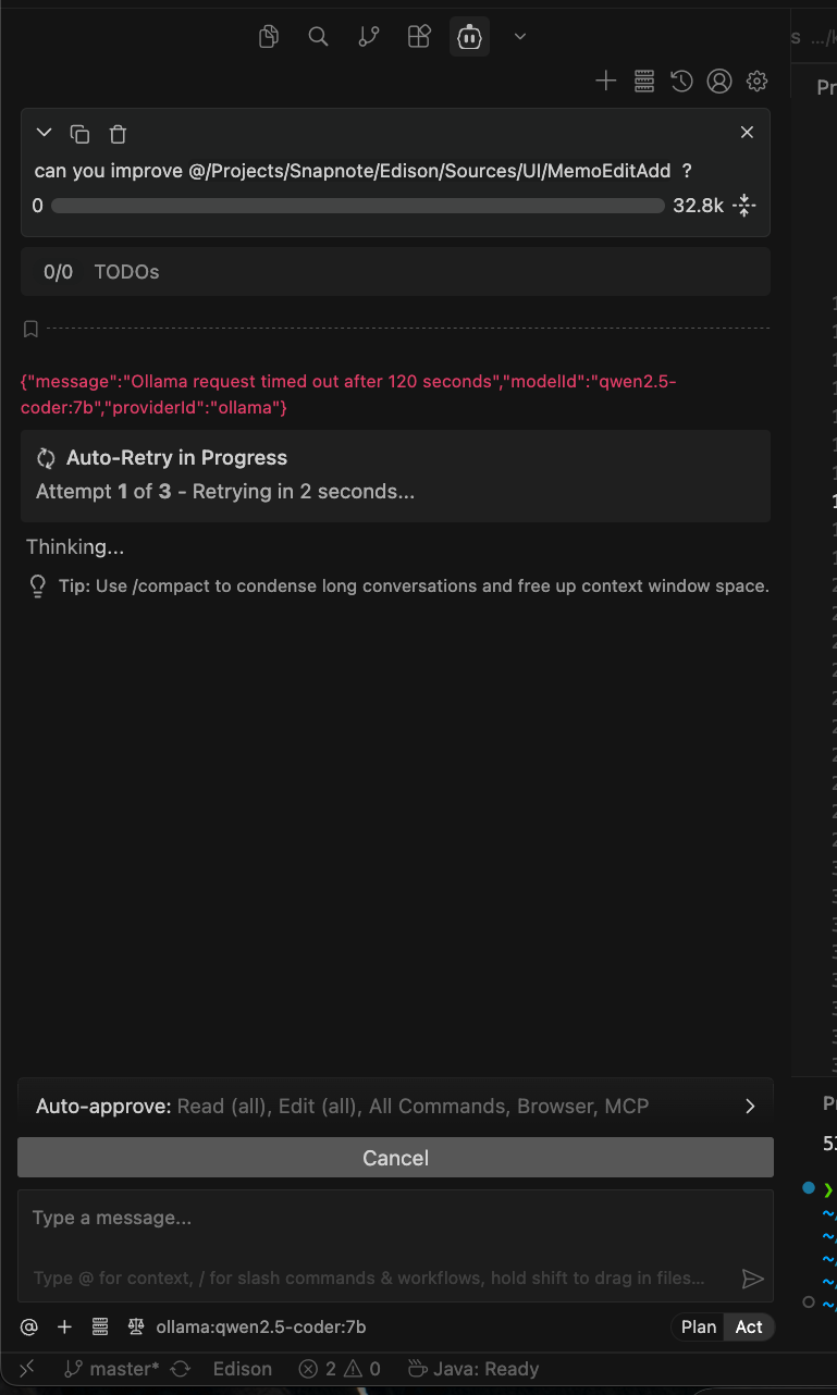 Switch between models depending on task complexity. For simple edits, use `qwen2.5-coder:7b` for faster responses.